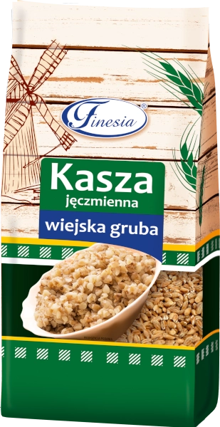 Kasza jęczmienna wiejska to produkt otrzymywany z przerobu oczyszczonego ziarna jęczmienia.Finesia Kasza jęczmienna wiejska to produkt o dużej zawartości białka, węglowodanów i składników mineralnych: fosforu, żelaza, wapnia, potasu, magnezu oraz witamin z grupy B. Jest ona także niezastąpionym źródłem niacyny, czyli witaminy PP, która ma duży wpływ na kondycję skóry. Witamina ta również ma ogromne znaczenie w procesach krwiotwórczych zapobiegając anemii. Wysoka zawartość witamin z grupy B ułatwia prawidłowe funkcjonowanie układu nerwowego oraz wpływa na stan i kondycję włosów. Największą jednak zaletą kaszy jęczmiennej jest bogactwo tzw. rozpuszczalnego błonnika, który przyczynia się do obniżania cholesterolu we krwi, a także który reguluje pracę przewodu pokarmowego.Kasza jęczmienna bardzo urozmaica jadłospis. Doskonale zastępuje zarówno ziemniaki, jak i makarony. Jest doskonałym dodatkiem do zrazów, pieczeni, sosów, czy zapiekanek.Kasze gruboziarniste wskazane są też dla osób cierpiących na zaparcia, hemoroidy oraz polipy jelita grubego.